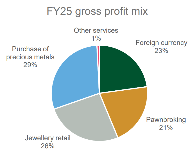 Jewellery retail includes both new and pre-owned items, with premium watches now a meaningful contributor. Pre-owned jewellery and watches typically carry higher margins and benefit from customer perceptions of tangible value, particularly during periods of economic uncertainty.